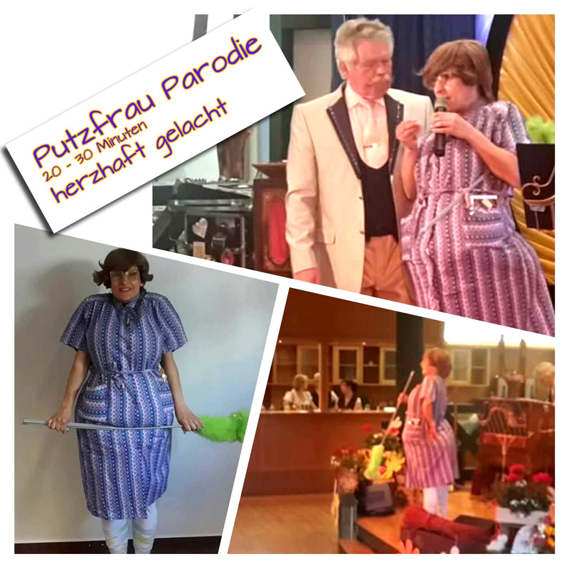 Wenn die Veranstaltung noch nicht vorbei ist und die Putzfrau vom Publikum überrascht wird, dann ist das wohl unsere Putzfrau, die nicht dafür da ist, um aufzuräumen, sondern, um Euch zum Lachen zu bringen!